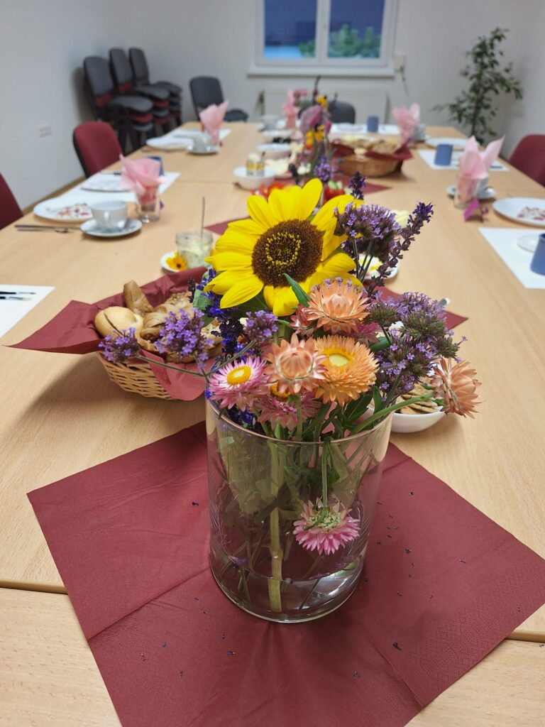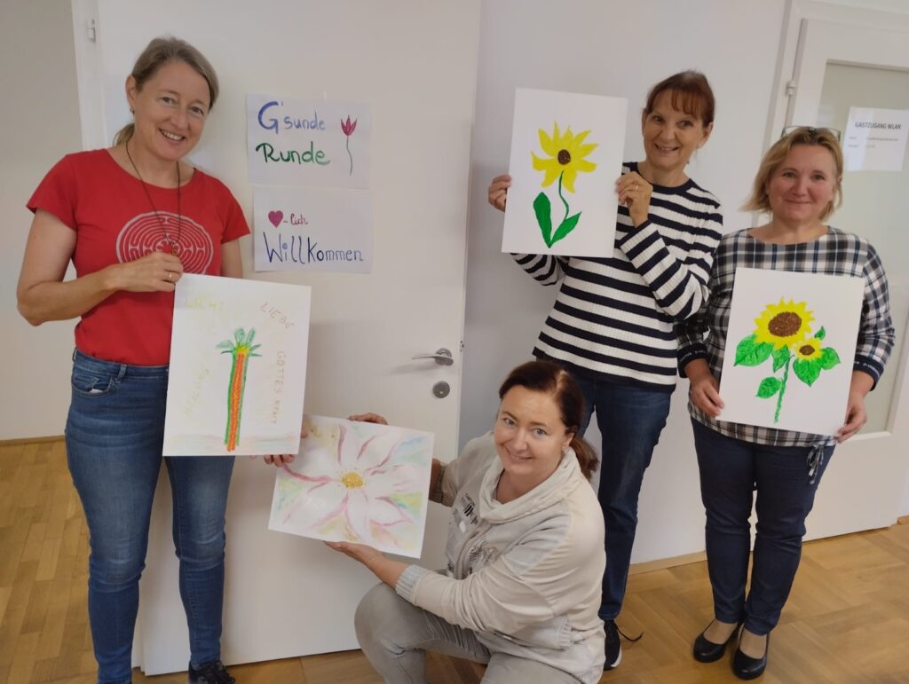 Die G’sunde Runde in Güssing startete am 16. September mit der neuen Projektkoordinatorin Katrin Csar und einem gesunden Frühstück im kleinen Kreis. Die Räumlichkeiten der Frauenberatungsstelle wurden zu einer spätsommerlichen Blumenwiese, welche zum kreativen Entfalten einlud.